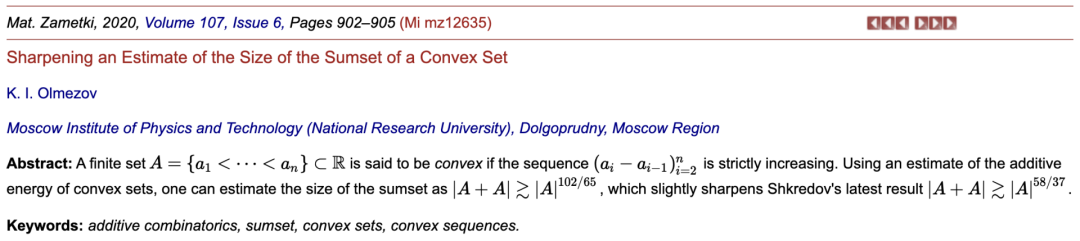 2020年,曾在期刊上发表了一篇题为「Sharpening an Estimate of the Size of the Sumset of a Convex Set」的论文。