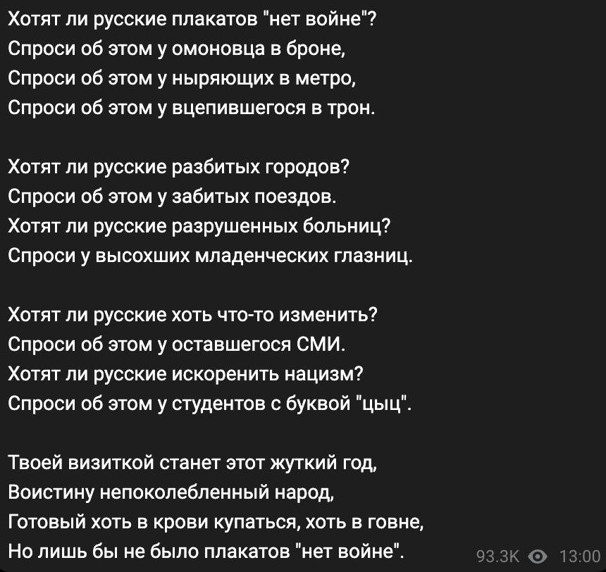 对我来说,答案是明确的:保持沉默,撒谎,假装周围什么都没有发生,是不值得的;而呆在监狱里完全无能为力,是可耻的;不断寻求帮助,害怕所有人是可耻的;开始游击战,在别国领土上伤害另一个国家是双重可耻的。