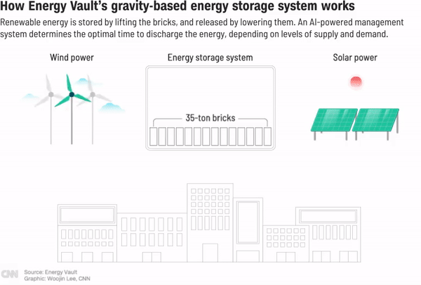 弹性中心将使用同样的砖块,它们由土壤和废品制成,建筑将有100米左右的高度。砖块将在建筑内通过手推车上下移动,由AI系统控制,然后根据供应和需求确定充电或放电的最佳时间。