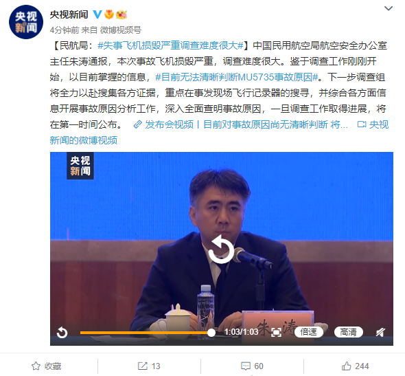 3月22日晚,据央视新闻报道,中国民用航空局航空安全办公室主任朱涛通报,本次事故飞机损毁严重,调查难度很大。朱民表示,鉴于调查工作刚刚开始,以目前掌握的信息,还无法对于事故的原因有一个清晰的判断。