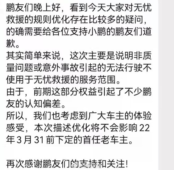 鹏友们晚上好,看到今天大家对无忧救援的规则优化存在比较多的疑问,的确需要给各位支持小鹏的鹏友们道歉。