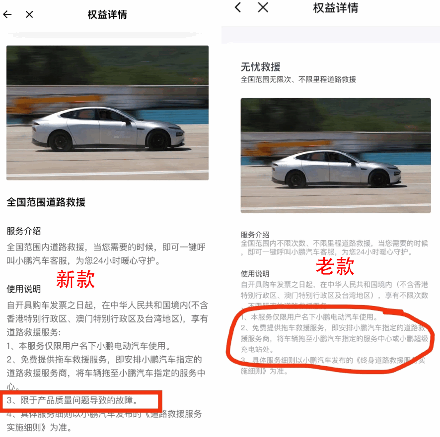 但如今,车主上传的图片显示,关于“全国范围道路救援”服务,小鹏汽车变更为,限于产品质量问题导致的故障,才会提供免费拖车救援服务。
