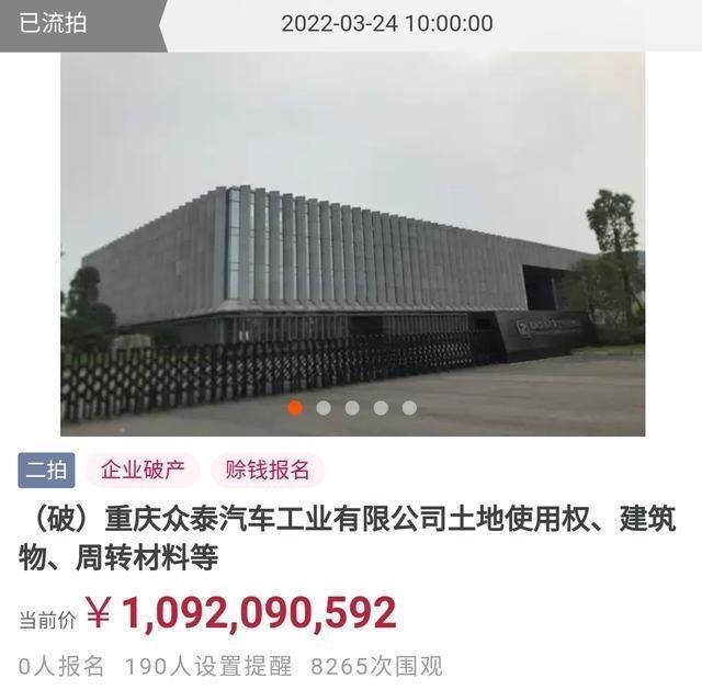 日前,据报道,重庆众泰汽车工业有限公司(以下简称“重庆众泰”)的土地使用权、建筑物、周转材料等资产在阿里拍卖破产强清平台进行二次拍卖,因无人报名出价而再度流拍。