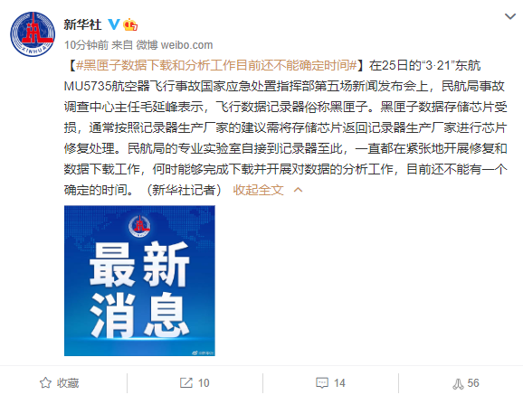 在发布会上,民航局事故调查中心主任毛延峰表示,飞行数据记录器俗称黑匣子。黑匣子数据存储芯片受损,通常按照记录器生产厂家的建议需将存储芯片返回记录器生产厂家进行芯片修复处理。