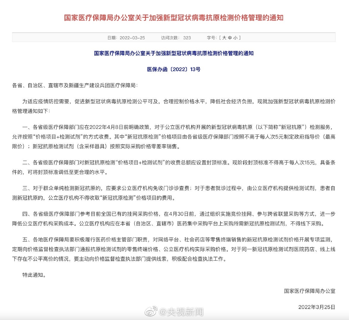 据@央视新闻 官微报道,国家医保局今日发布公告(点击查看原文),其中指出各省级医疗保障部门应在4月8日前明确政策,对于公立医疗机构开展的新型冠状病毒抗原检测服务,允许按照“价格项目+检测试剂”的方式收费。