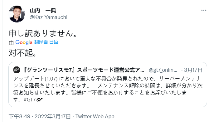 而就在玩家疯狂炎上官推的同时,“GT赛车”系列的制作人山内一典终于站了出来,转发了官推并致歉。同时,也在游戏官网上放出了他写给玩家的一封信。