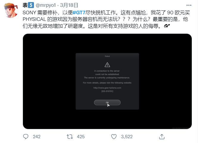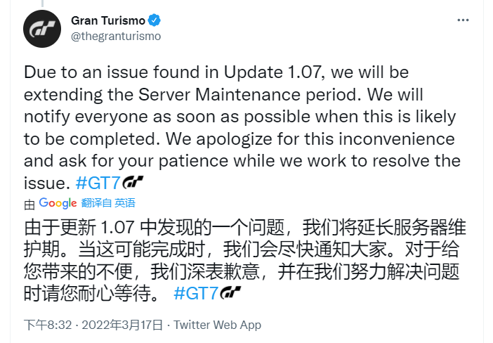 3月17日当天,《GT赛车7》开启了原定两小时内完成的服务器维护,但两小时过去后,玩家打开游戏发现依旧无法连接服务器。而因为游戏强制全程联网游玩的机制,在无法连接服务器的情况下,玩家只能继续等待,或者游玩包括新模式音乐拉力赛在内的非常有限的内容。一直等到二十四小时过去后,全球的《GT赛车7》玩家依旧没能等来游戏的重新上线,这引发了不少玩家的不满。毕竟,对于一款刚推出不久的游戏来说,如此漫长的维护时间,是极为少见的。而无法按时完成维护,以及在维护期间无法离线游玩单人内容,对于系列粉丝来说无疑是个巨大打击。官方虽然很快对维护延期做出了解释,但并没能给出具体的恢复时间。