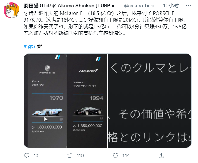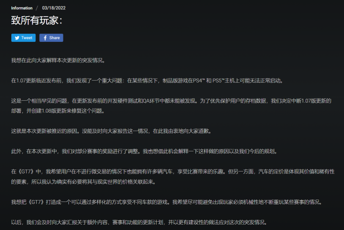在这封信中,山内讲述了服务器维护延期的原因,是因为发现了会导致游戏无法正常在PS4、PS5主机上运行的恶意BUG,所以游戏直接中断了1.07版本的更新,并抓紧时间推送了修复后的1.08版本。而对于玩家最在意的比赛收益和车辆售价问题,山内的解释是,希望玩家能在享受比赛乐趣的同时,不机械性地重复体验相同的比赛,而游戏也需要通过将虚拟车辆售价与其现实价值关联的方式,体现其价值和稀有性。但这样的解释,却进一步引发了玩家的抗议。