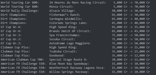 而事情到这里还只是开始,等到三十多个小时的服务器维护时间终于结束后,重新登录游戏的玩家,发现官方在此次维护后的游戏1.08版本中,对老版本的比赛收益进行了大改。具体以下面这张游戏中比赛收益变化图为例,对比更新前后,你会发现除了开头两张赛道的比赛奖励,从5000Cr(游戏内货币)上涨到70000Cr外,其他赛道的结算奖励全部都遭到了30~50%的削减,即便加上局内公平竞赛获得的额外收益,玩家在单场比赛中获得的总收益,相比游戏中动辄几百几千万的赛车售价,还是显得微不足道。