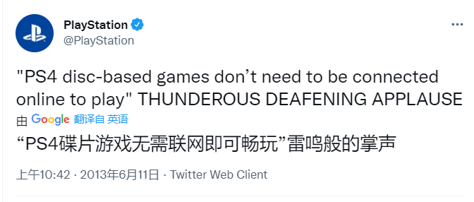 更为讽刺的是,在当年微软Xbox 刚刚因为宣布游玩必须全程联网,而遭受了国外网友的一顿炮轰后,当时国外PlayStation的官推还曾发文阴阳怪气过对方,称“PS4游戏光碟无需联网即可畅玩”,并配上了“雷鸣般的掌声”。而现在,爱整活的网友也把这句话的截图,发在了“GT赛车”官号的道歉声明下。