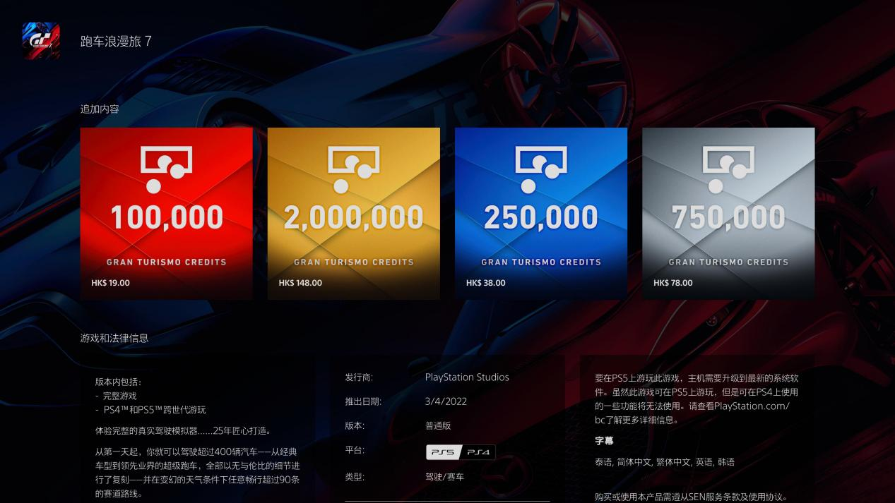 而根据不同地区玩家的反馈,在更新了最新的1.08版本后,玩家想要通过氪金的方式获取游戏中的高级车辆,往往需要额外花费一笔不小的开销。以我自己所在的港服为例,在PlayStation商城的购买选项中,200万Cr点数的售价是148港币(约合120元人民币),因此倘若我想要在游戏中直接购买一辆售价330万Cr的车,我需要花费至少304港币(200W+75W+75W),折合人民币247.5元,基本已经快赶上一款正常PC游戏的售价了。