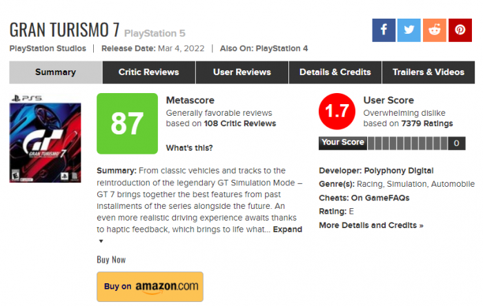 纷纷开始在游戏论坛和社交平台上,炎上了《GT赛车7》的制作团队Polyphony Digital工作室和其背后的索尼。甚至在评分网站Metacritic上,媒体评分高达87分(满分100分)的《GT赛车7》,玩家评分已经跌至1.7分(满分10分),成为所有索尼旗下工作室出品的游戏中,玩家评分最低的作品。直至今日,围绕《GT赛车7》展开的官方与玩家的纠纷,依旧没能得到平息。