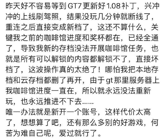 也有少部分玩家在更新完游戏新版本后,出现了不同程度的存档丢失和坏档问题,这意味着他们此前所有耗费在《GT赛车7》上的努力,全部将付诸东流,虽然这个问题只在少数玩家的机器上出现,但这也体现出游戏全程联网所带来的风险,而官方似乎至今还没有对此问题提供解决方案。