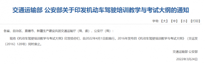 3月25日,据交通运输部网站消息,近日,交通运输部、公安部联合发布《机动车驾驶培训教学与考试大纲》,将于2022年4月1日起施行。其中,《机动车驾驶培训教学大纲》围绕培养安全文明高素质驾驶员的核心,对机动车驾驶培训教学内容、教学要求及学时等进行了修订完善。