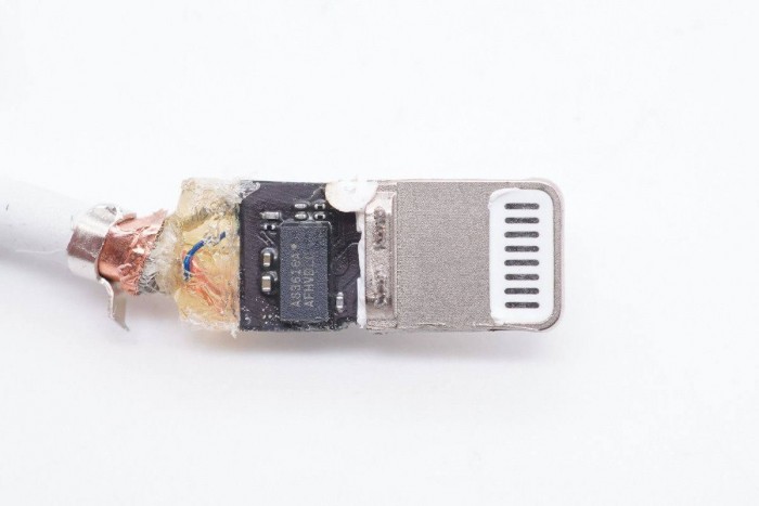 其实,USB-C to Lightning数据线也可以从Lightning端上取电,反向输电至USB-C端,内部芯片支持反向电流传输,这包括了苹果MFi认证C94数据线、破解方案的非MFi认证数据线。