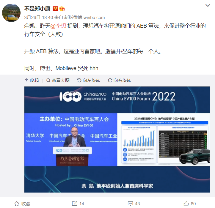日前,中国电动汽车百人会高层论坛中,理想汽车CEO李想表示,建议乘用车应标配AEB(紧急制动)功能。同时,有博主透露,理想汽车将开源他们的 AEB 算法,来促进整个行业的行车安全。