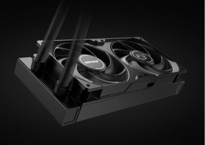 散热方面,加入了“鳃纱”技术,精细加工铜质密集水道直触设计,增加接触面积,搭配两个120mm定制流体长浆扇叶风扇组成的240mm冷排,内部一体式铜底,360度可旋转冷头,还有族徽背板。