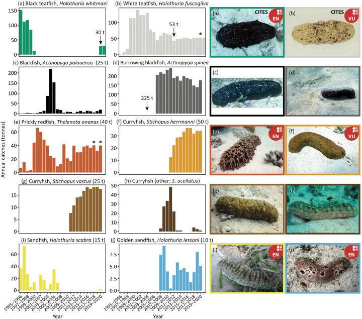 猪婆参被列入《濒危野生动植物种国际贸易公约》(CITES),这为限制其捕捞和出口提供了强有力的依据。然而,其中的两个物种,白猪婆参和黑猪婆参,占昆士兰渔业最近总捕获量的20%以上。