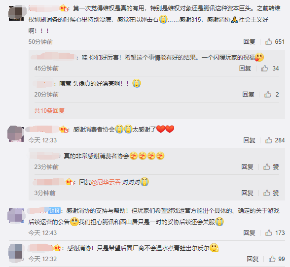 诸多《云裳羽衣》玩家在此条微博评论区留言,对中消协的支持与帮助表示感谢。