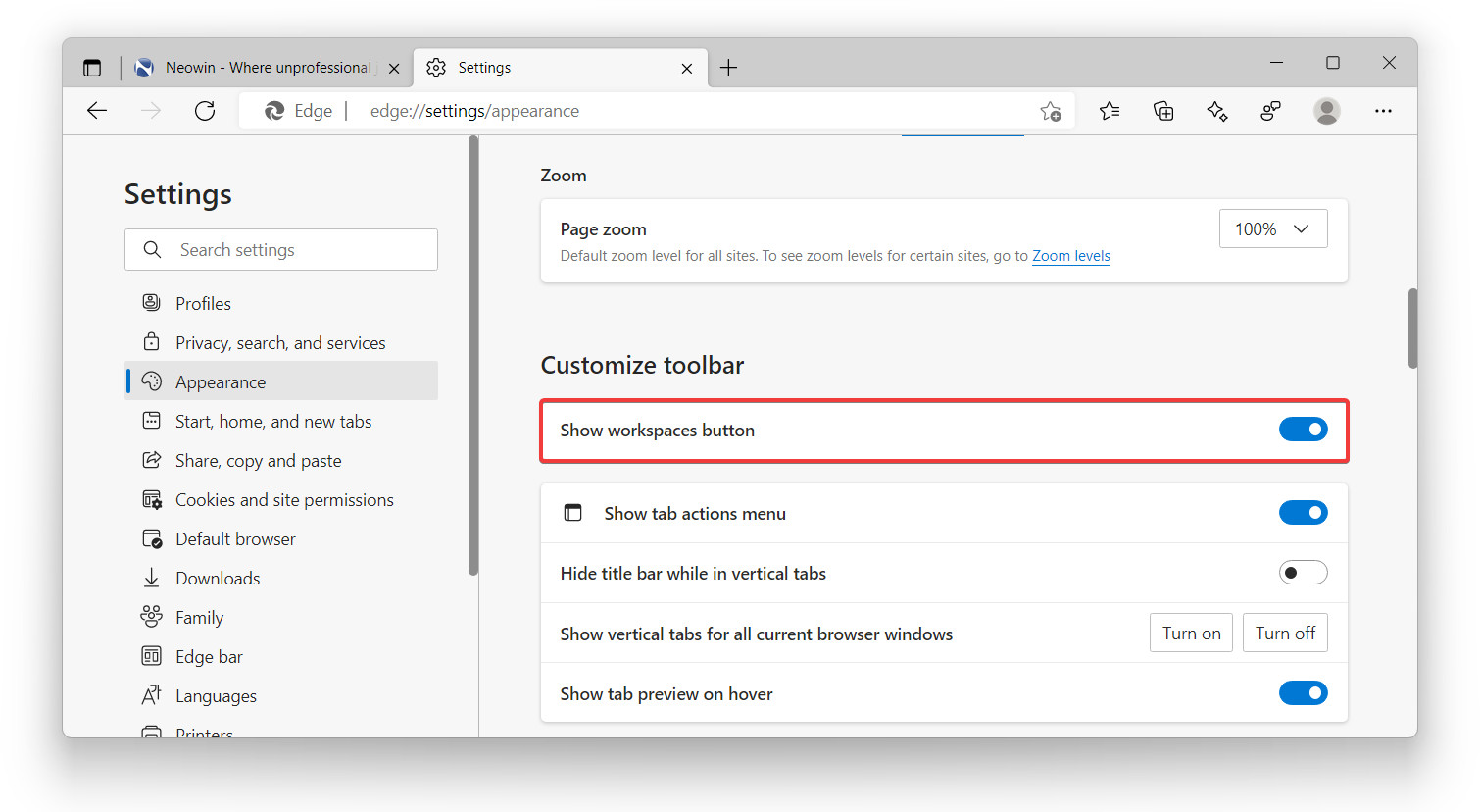 起初微软将该按钮放在了浏览器的左上角,但这次尚不清楚开发者打算放哪 —— 尽管存在于设置中,但用于启用 / 禁用工作区的切换暂不起作用。