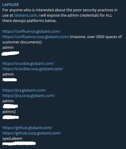 黑客们还公布了一份用于访问其源代码共享平台的公司凭证清单,包括 GitHub、Jira、Crucible 和 Confluence。恶意软件研究小组 VX-Underground 在Twitter上发布了黑客 Telegram 帖子的编辑截图,其中显示该小组发布了他们声称是Globant的密码,如果得到证实,攻击者很容易猜到这些密码。