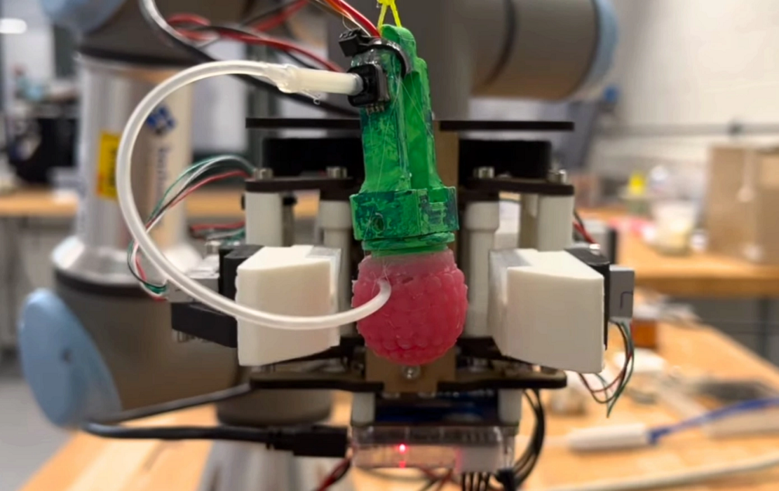 复制的浆果有一个流体传感器,它会告诉系统硅酮液滴所经历的压缩程度,进而使得控制模型能够学习如何调整其抓力。