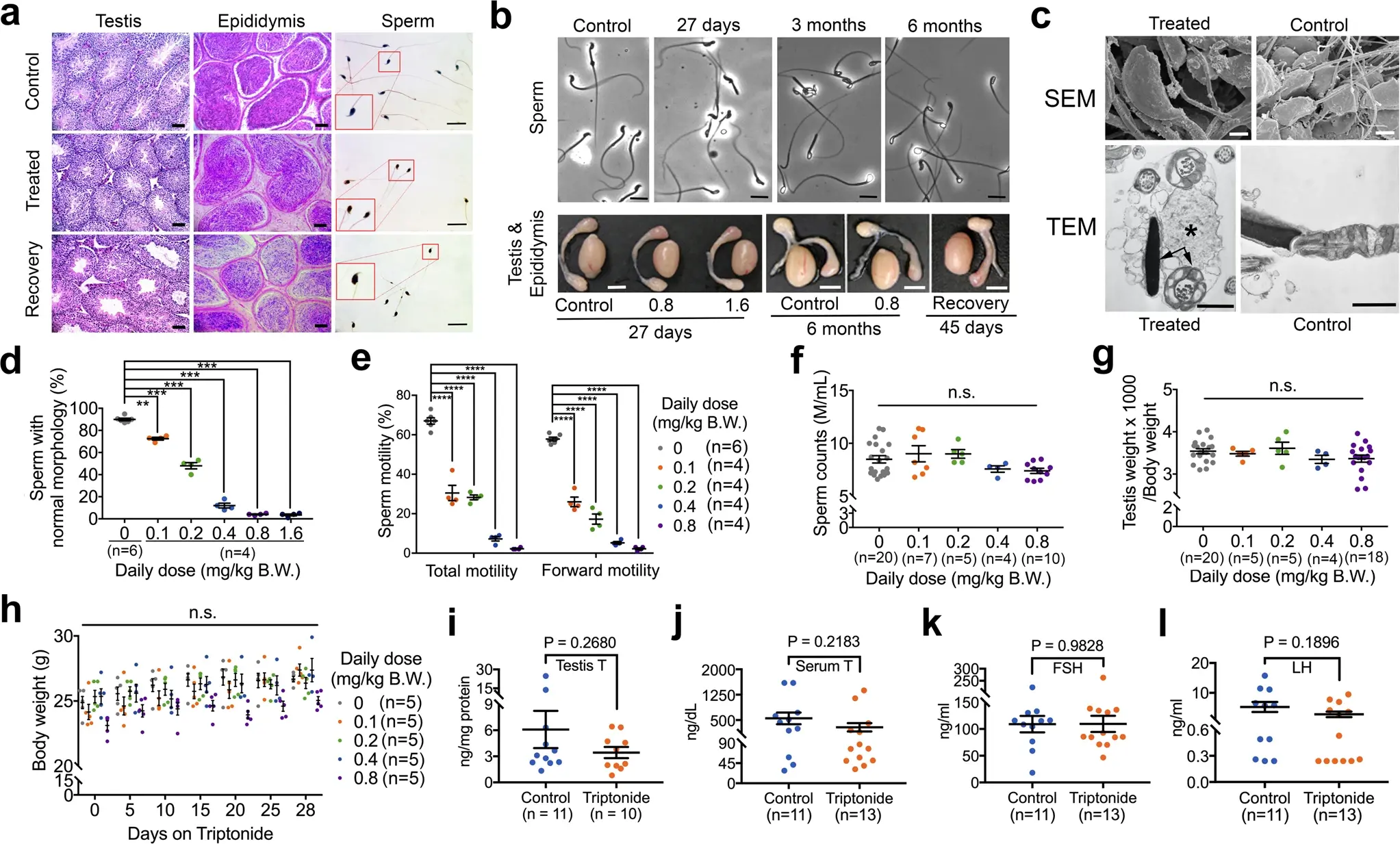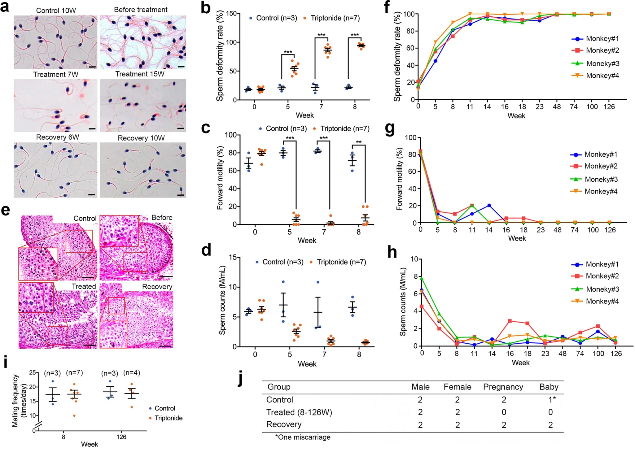 每天单次口服公藤内酯醇,就会诱发精子的改变,使其具有最小或没有向前的运动能力,并接近 100% 的渗透率,从而在 3-4 和 5-6 周内导致男性不育。一旦停止治疗,雄性在大约 4-6 周内又变得有生育能力,并能产生健康的后代。