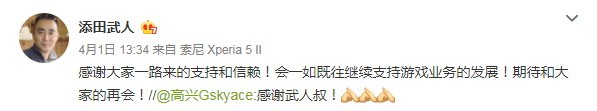 添田武人在微博上回应称:“感谢大家一路来的支持和信赖!会一如既往继续支持游戏业务的发展!期待和大家的再会!”
