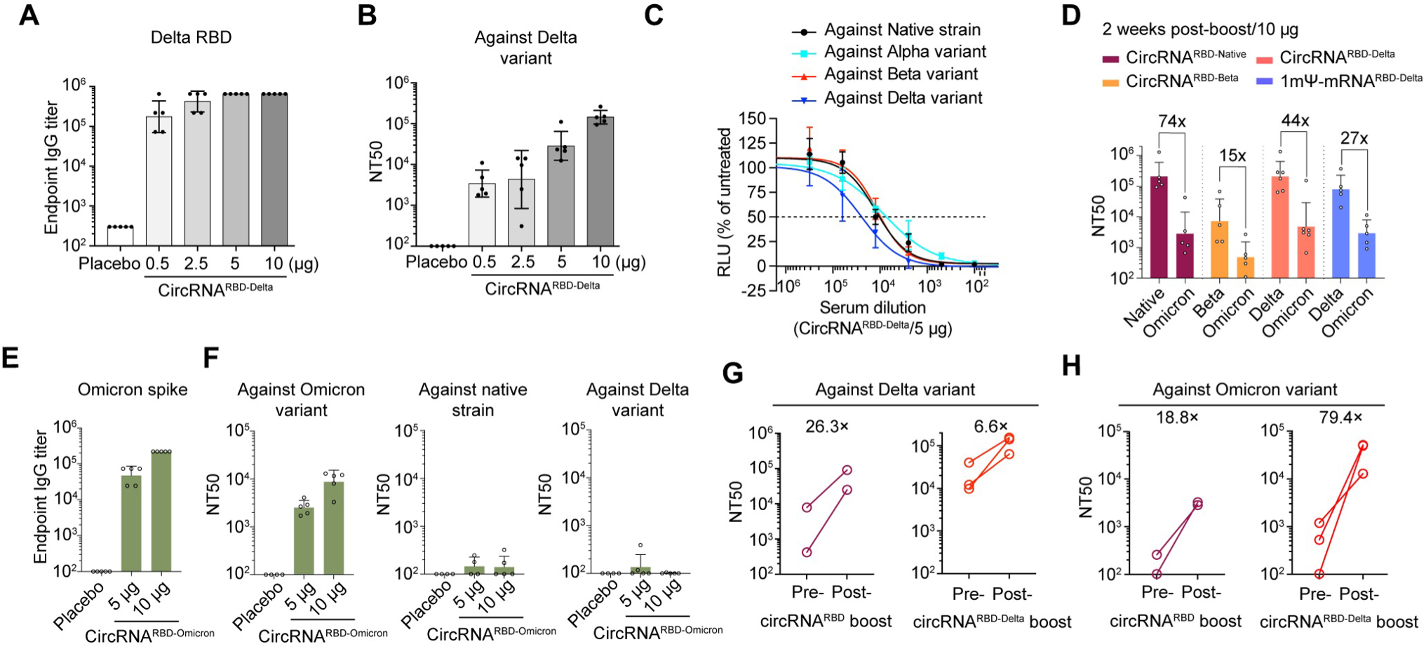 不过,针对德尔塔变异株设计的环状RNA疫苗(circRNA^RBD-Delta)可以在小鼠体内诱导产生广谱的中和抗体,有效中和包括奥密克戎株在内的多种新冠变异株。他们在讨论中指出,这一针对德尔塔变异株设计的环状RNA疫苗或许可以作为现有疫苗接种后的有效加强针选择,希望进一步的试验能证明这一点。