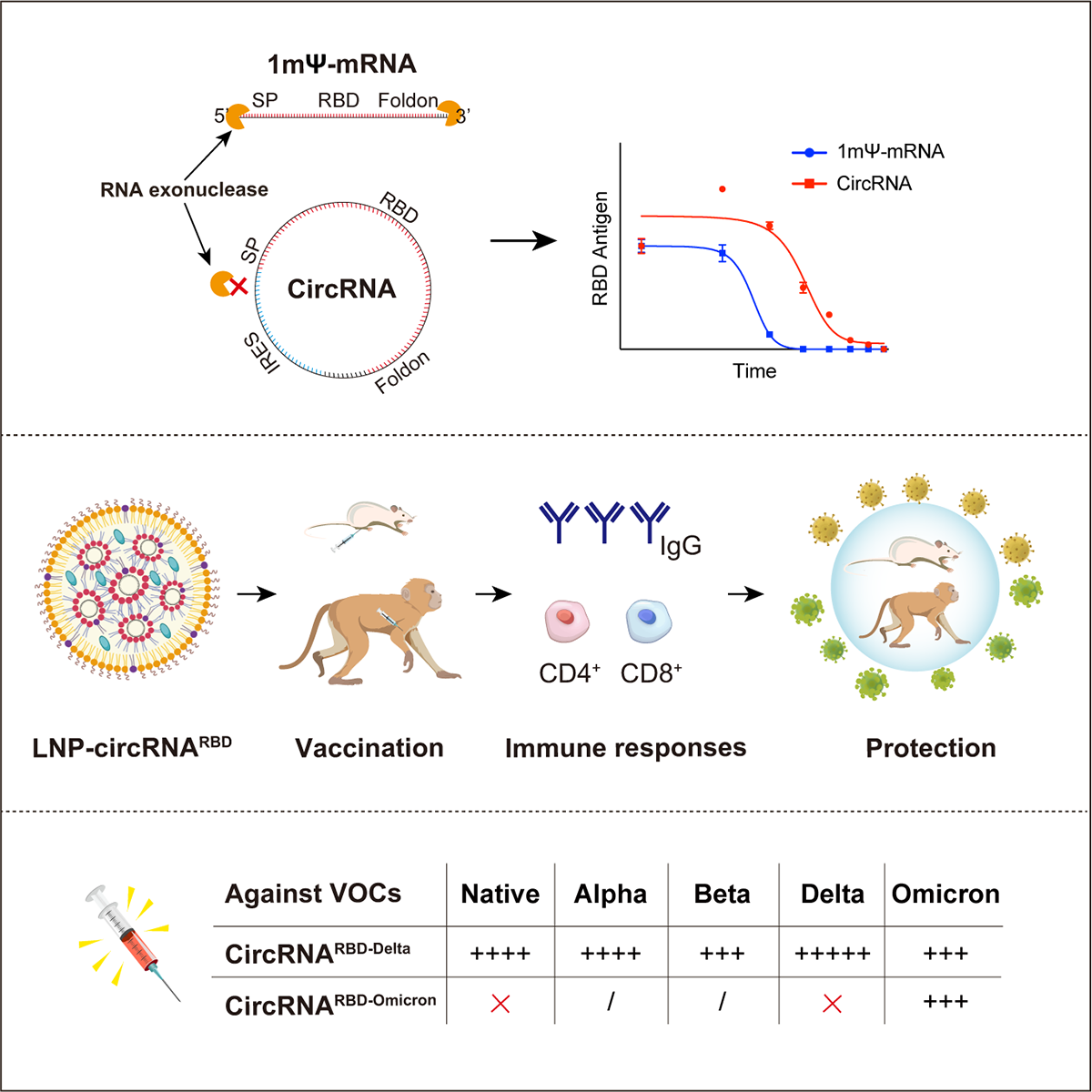 实际上,该研究于今年1月在预印本bioRxiv提前发布,而和团队在去年3月发表的 bioRxiv论文相比,他们继小鼠后在恒河猴上也验证了他们开发的编码新冠病毒刺突蛋白三聚体受体结合域(RBD)的环状RNA疫苗(circRNA^RBD)能够引发有效的中和抗体和T细胞应答。