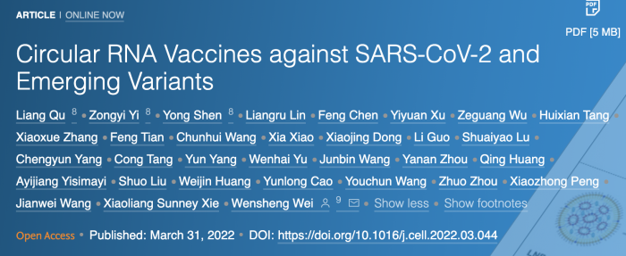 当地时间3月31日,顶级学术期刊《细胞》(Cell)在线发表了中国团队的一项最新研究,题为“针对SARS-CoV-2和新出现变异株的环状RNA疫苗”(Circular RNA Vaccines against SARS-CoV-2 and Emerging Variants)。该研究首次报道了环状RNA疫苗技术平台,以及据此开发的针对新冠病毒及其一系列变异株的环状RNA疫苗。