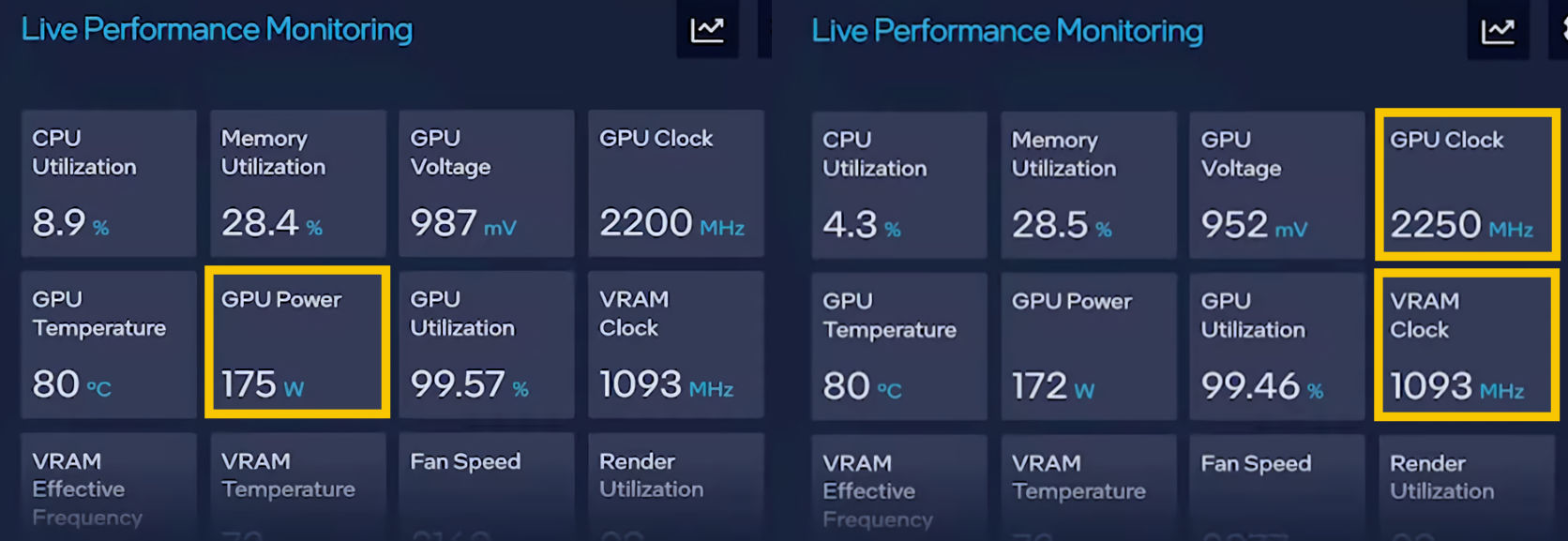 演示期间,英特尔展示了 ARC 控制面板的一些数据,比如内存 / 显存频率和 GPU 功耗,并且能够叠加在游戏画面上呈现。