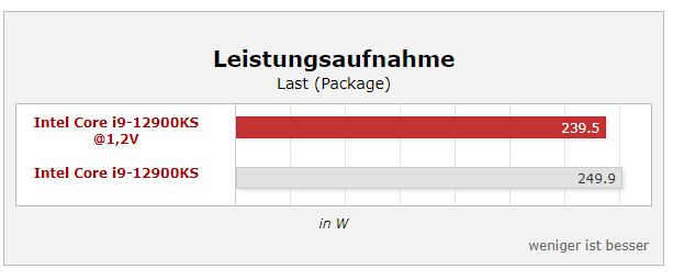 降压之后,酷睿i9-12900KS的功耗也降低了,峰值从250W降至240W左右,减少了10W,虽然差距不是很大,但总算是低了。