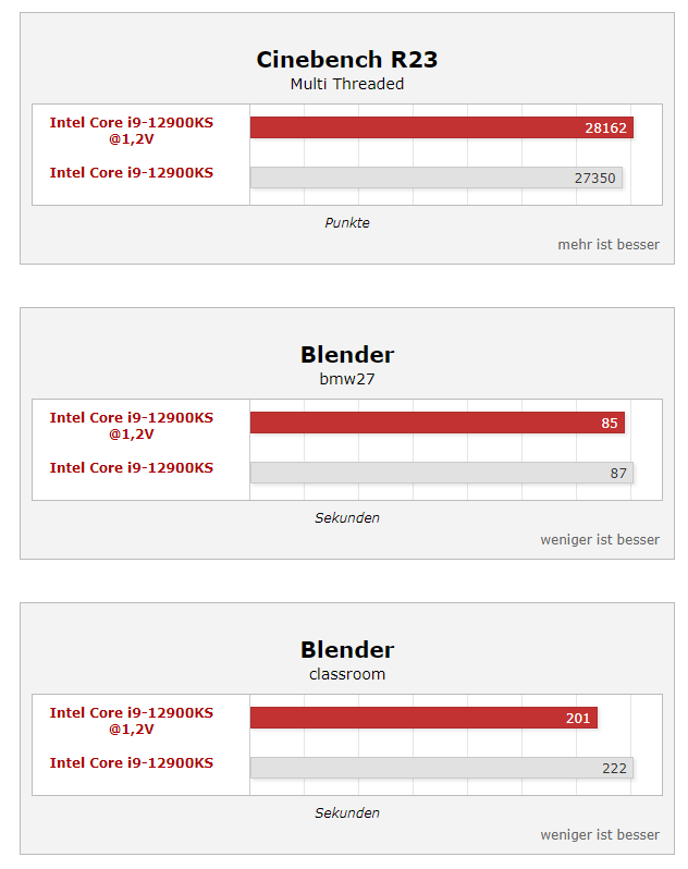 首先是性能测试,除了第一个跑分是越高越好之前,后面的Blender渲染测试都是越低越好,将压倒1.2V的酷睿i9-12900KS在性能上甚至有21秒的优势,这个差距就很大了。