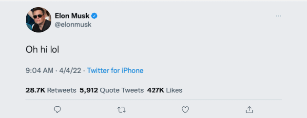 收购消息公布后,马斯克表现得异常平静,只以推特公司最大外部股东的身份发表一条推文:“哦,嗨,哈哈”。半小时后,正常的马斯克回来了,开展了一次足以令Parag Agrawal胆战心惊的投票:“你们想要一个‘编辑’按钮吗?”
