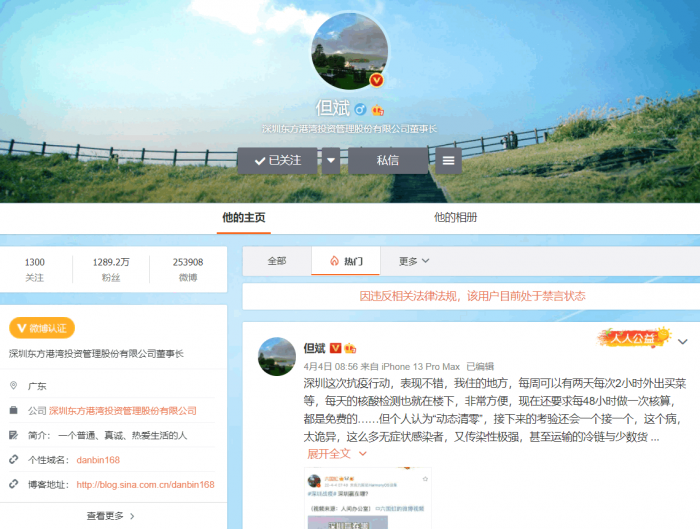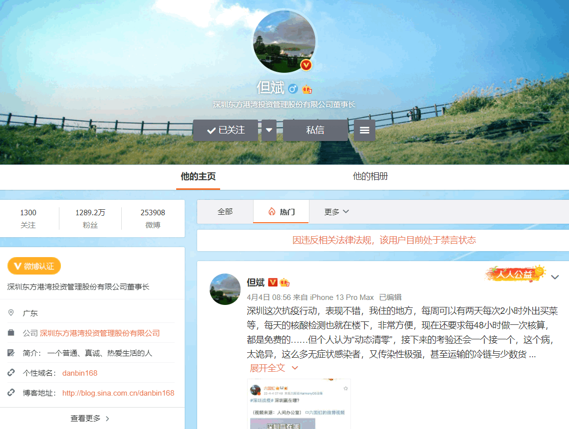 4月6日消息,深圳东方港湾投资管理股份有限公司董事长但斌的微博显示:“因违反相关法律法规,该用户目前处于禁言状态。”截至目前,但斌最后一条微博停留在4月5日晚。