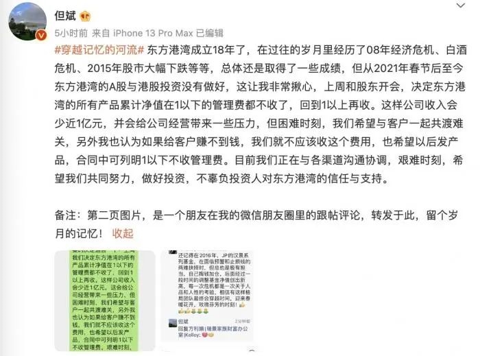 此外,但斌也坦言,从2021年春节后至今东方港湾的A股与港股投资没有做好。在上周和股东开会之后,决定东方港湾的所有产品累计净值在1元以下的免收管理费,这样公司收入会少近1亿元,并会给公司经营带来一些压力。但在困难时刻,希望与客户一起共渡难关。