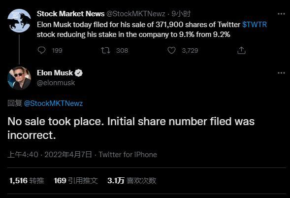 此外,名为@StockMKTNewz的推特账号声称,马斯克提交了出售37.19万股推特股票的申请,将其在该公司的持股比例从9.2%降至9.1%。