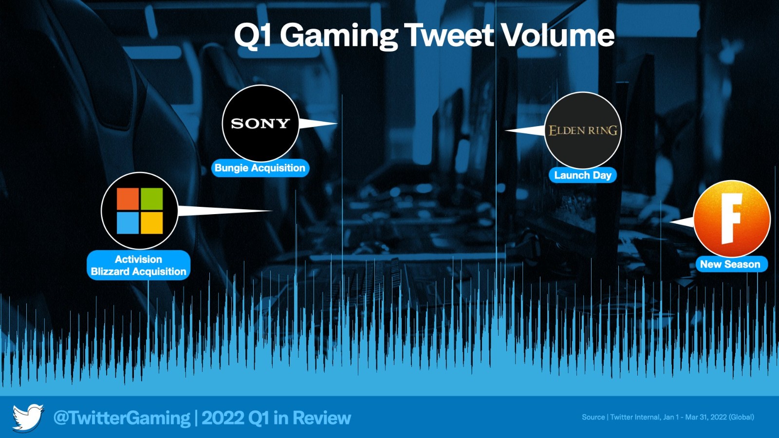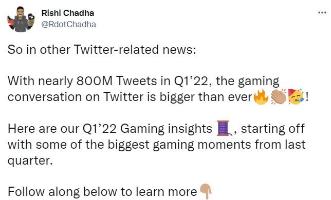 Twitter的全球创作者和游戏内容合作负责人Rishi Chadha在发布了这些内部数据,这些数据显示了2022年第一季度有关游戏的推文讨论频率何时飙升。