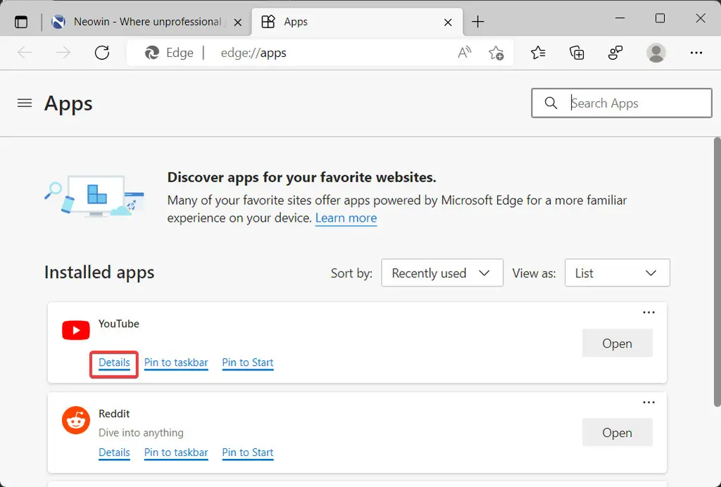 6. 跳转到 edge://apps,找到你需要的网络应用,然后点击详细信息。