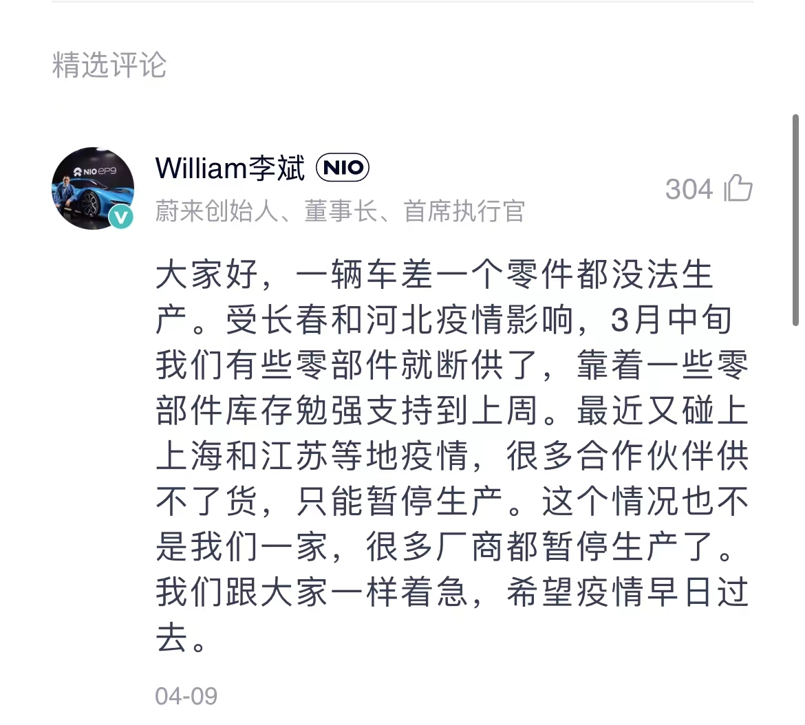 值得一提的是,蔚来创始人、董事长兼CEO李斌在“说明”评论区表示,受长春和河北疫情影响,3月中旬我们有些零部件就断供了,靠着一些零部件库存勉强支持到上周。