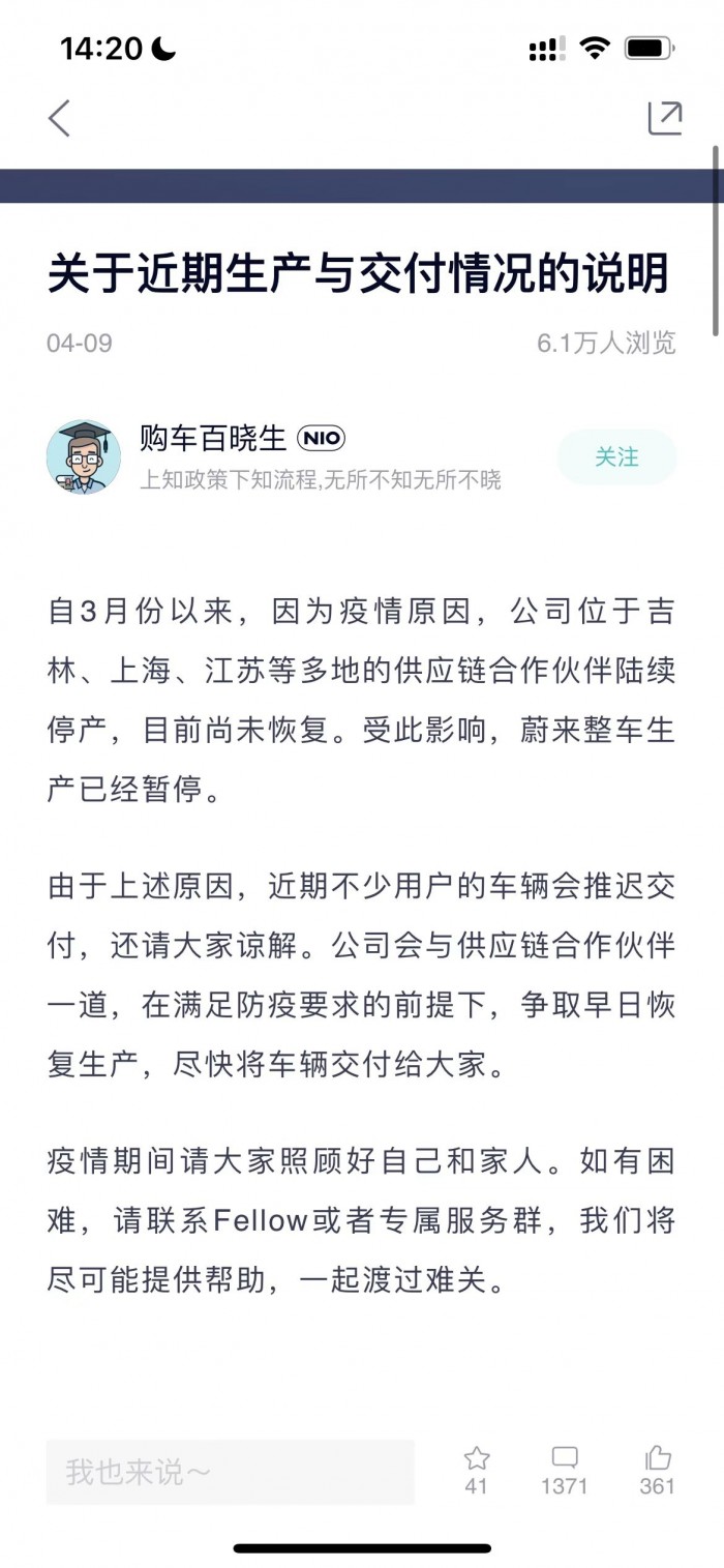 日前,蔚来汽车在其官方App上发布“关于近期生产与交付情况说明”,说明指出,自3月份以来,因为疫情原因,公司位于吉林、上海、江苏等多地的供应链合作伙伴陆续停产,目前尚未恢复。官方称,受此影响,蔚来整车生产已经暂停。由于上述原因,近期不少用户的车辆会推迟交付,还请大家谅解。
