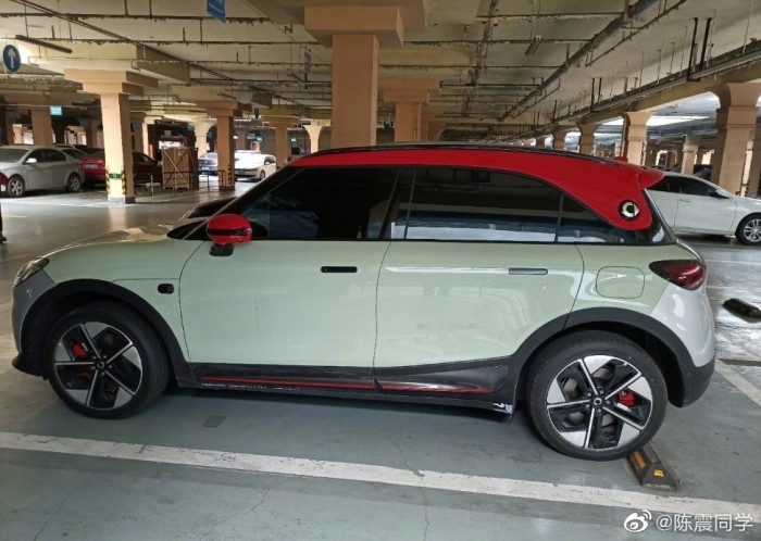 与官方发布的照片不同,实车虽然也保持了圆润的设计,但浅绿色车身,红色车顶、白色车头和车尾、黑色A/B/C柱的搭配,着实让人有点意想不到,这也是让很多人吐槽的点,毕竟怎么看都十分廉价。