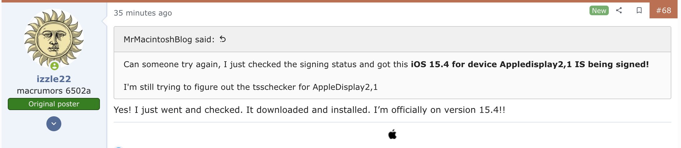 几小时后,苹果为Studio Display重新签署了iOS 15.4,使客户的软件更新再次成为可能。