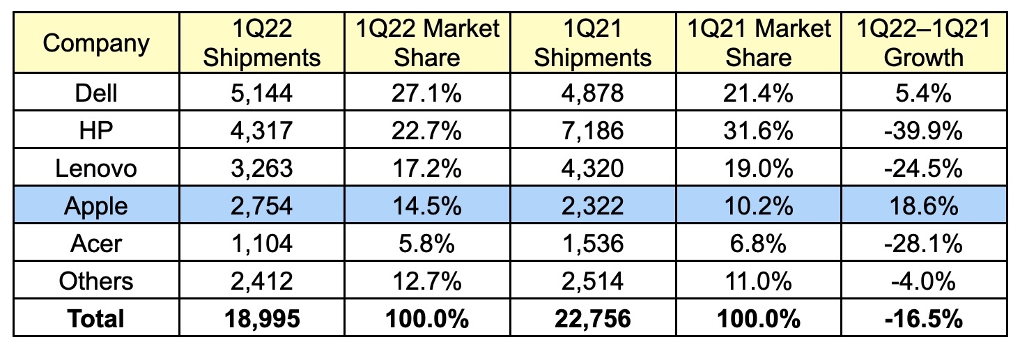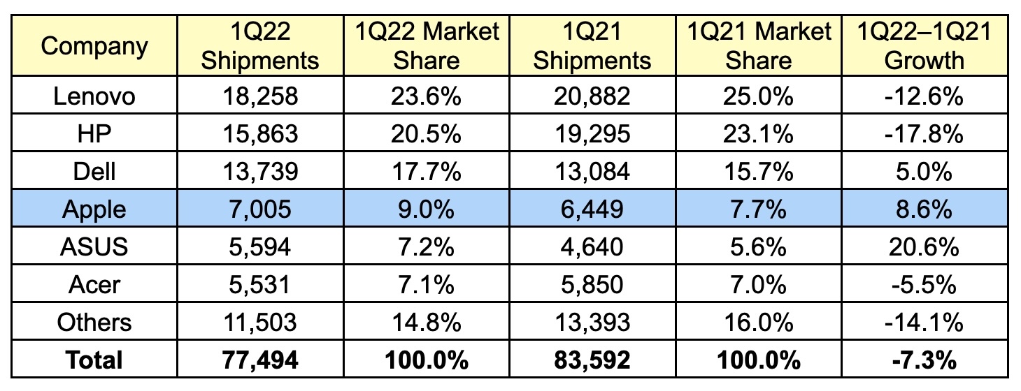 北京时间4月12日消息,2022年一季度,苹果Mac全球出货量约为700万台,一年前同期为650万台,同比增长8.6%。按照Gartner的统计,一季度苹果Mac在全球PC市场的份额为9%,排在第四位,上年同期份额为7.7%。全球PC市场并不稳定,一些制造商的出货量下滑。