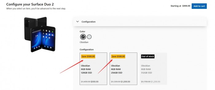 4月12日消息,微软美国在线商店显示,微软Surface Duo 2直降500美元(约合人民币3200元),128GB版本到手价为999.99美元(约合人民币6400元),256GB版本到手价为1099.99美元(约合人民币7000元)。