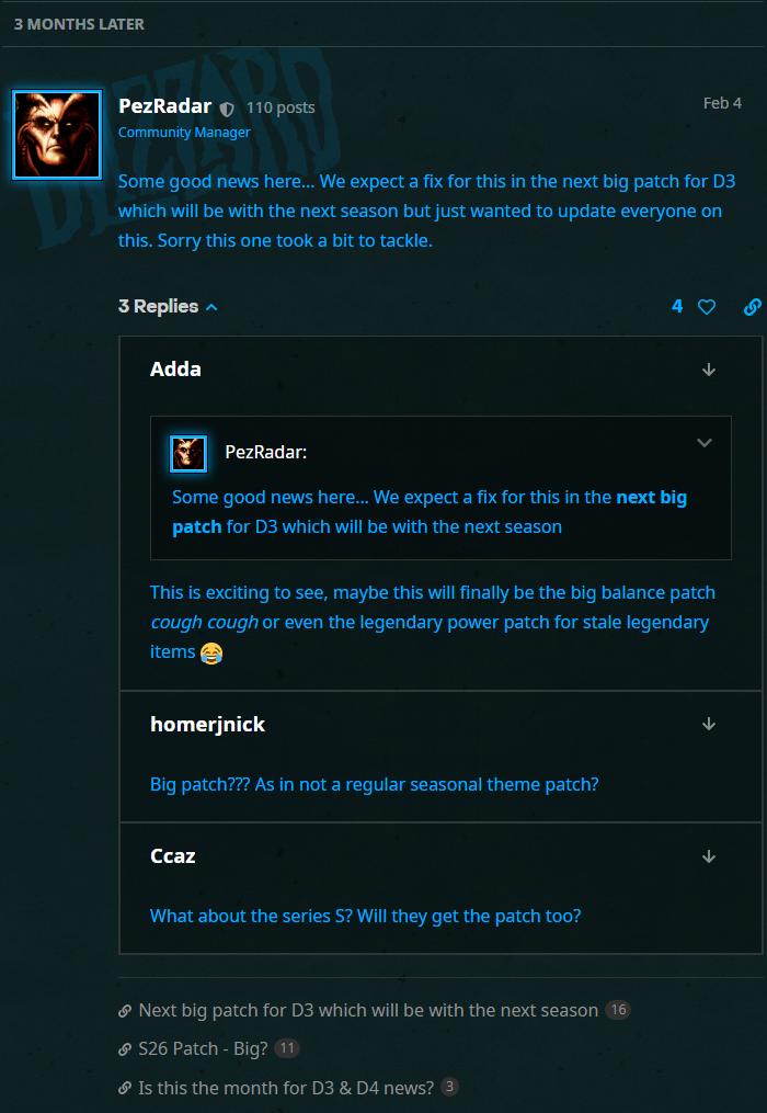 在玩家们于暴雪论坛上吐槽数月之后,社区主管 PezRadar 于今年 2 月份给出了一则答复。其宣称,如果一切顺利的话,《暗黑破坏神 III》的下一个大补丁有望于二季度到来。
