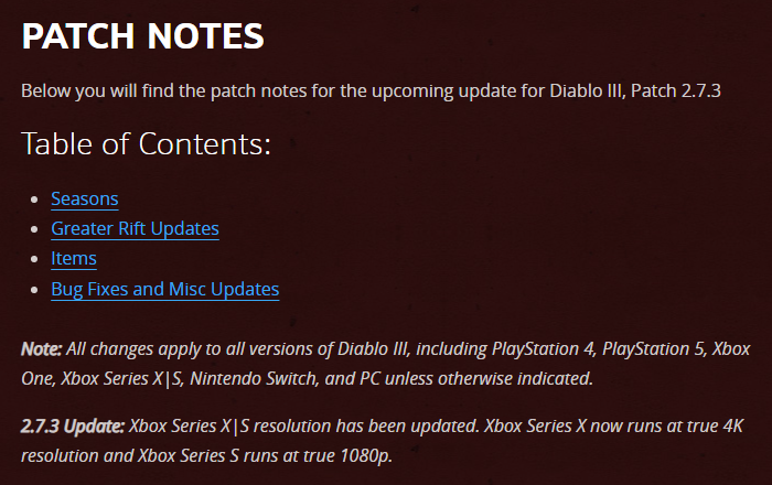 官方表示,2.7.3 更新将解锁次世代主机的分辨率限制,从而让大家能够以“真”4K 来畅爽体验《暗黑破坏神 III》—— 其中 XSX 最高支持 4K、而 XSS 最高为 1080p 。