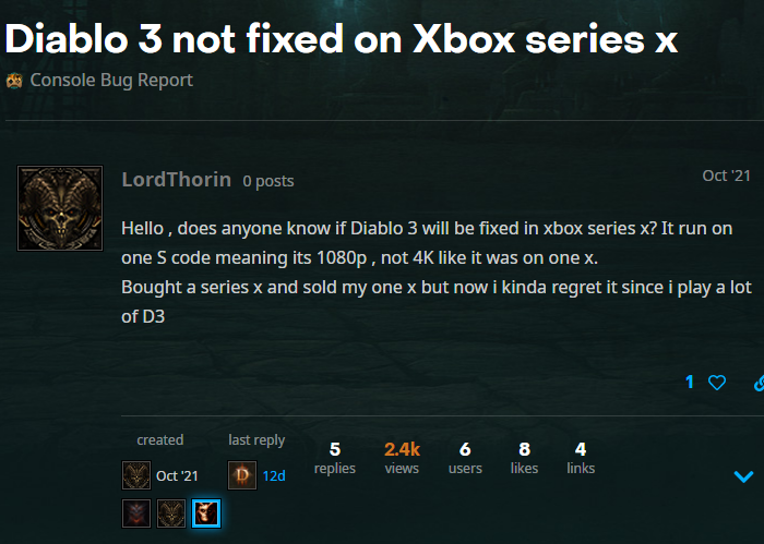 随着暴雪新补丁的发布,《暗黑破坏神 III》终于能够在 Xbox Series X | S 上启用“真”4K 分辨率了。WCCFTech 指出,虽然 Xbox One X 有办法将游戏拉伸到 4K 分辨率,但一个 Bug 导致“向后兼容”的微软次世代主机无法无法做到同样的事情。在此之前,XSX / XSS 玩家只能体验到被锁在 1080p 的最高分辨率。