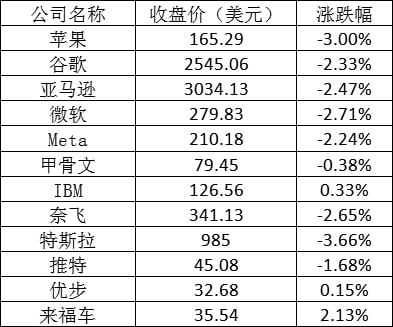 大型科技股普遍下跌,有关供应链中断的报道令苹果等科技公司的股价承压,苹果股价下跌3.00%;谷歌、亚马逊、微软Meta和奈飞跌幅均超过2%。